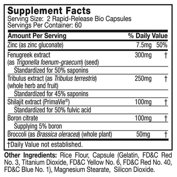 Includes a precise dose of zinc gluconate – a premium, highly absorbable form of zinc – has been shown to help maintain optimal testosterone production within the normal, healthy range. Fenugreek is standardized to 50% saponins.