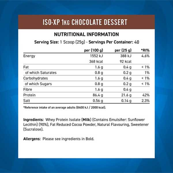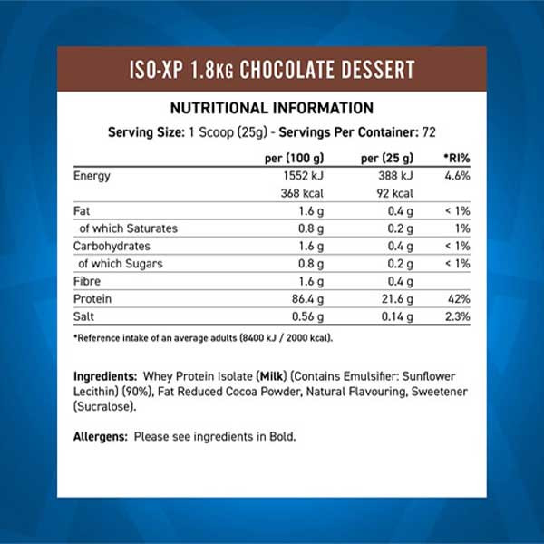 HIGH IN PROTEIN: our whey isolate protein powder delivers a whopping minimum of 21.6g of protein per serving, all whilst remaining low in sugars, and fats. ISO-XP even has less than 1g of carbs per serving!
