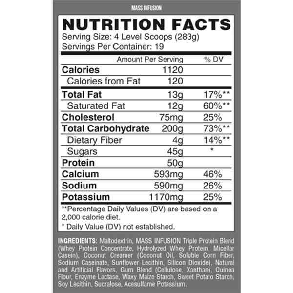 MASS INFUSION is an advanced weight gain formula supplying your body with 50 grams of high-quality protein per serving, over 1120 calories, along with 200 grams of carbohydrates. Its nutrient-dense formula is ideal for those athletes who are seeking to gain weight fast and become bigger and stronger. MASS INFUSION is packed with three different proteins. It is high in essential amino acids, and with its naturally occurring high level of BCAAs, it helps fuel muscle growth and strength development. Mass Infusion was created for the hard-gainers and athletes who are always looking to add on size. This can be consumed pre-workout, post-workout or as a meal replacement throughout the day