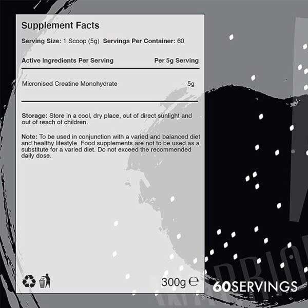 Warrior Creatine is a food supplement, and should be used as part of a balanced and varied diet. Do not exceed recommended dose. Store out of the reach of children. Please consult your Doctor prior to use if you have a medical condition. Not recommended for pregnant or lactating women. Produced in an environment that produces Milk, Egg, Soy, Wheat, Peanuts and Nuts.